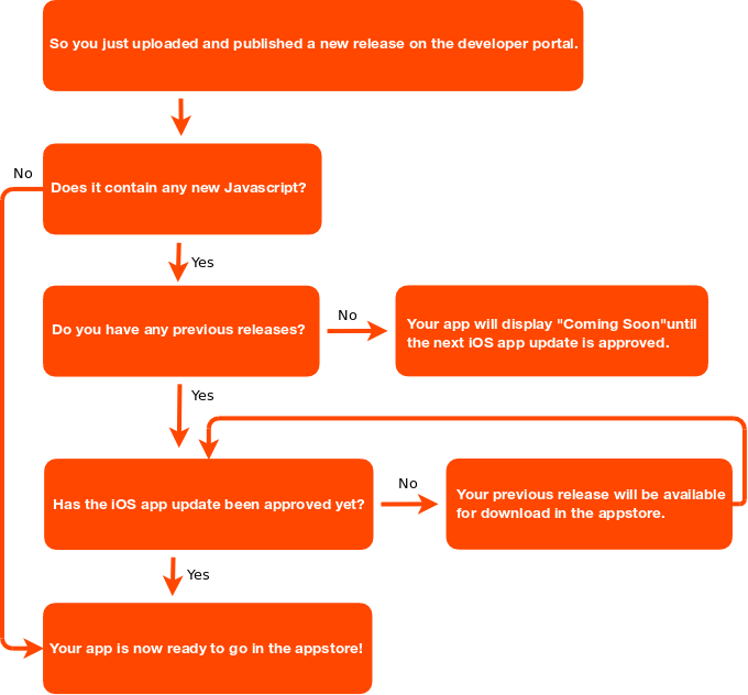 The same process is true for updates but if you have an older version of the app that is published and included in a previous iOS release, we will show this version to iOS users. Users will not see the "COMING SOON" button, but the newest version of your app will not be available until the new iOS app is published and users have updated their iOS apps. If you need expedite process for a JavaScript update, you can contact us.