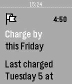 This is where Battery+ began. I wanted to remake Battery Leak, but in the process I wanted to have a larger data range (Battery Leak held one week) and I wanted to have intelligent battery life predictions. Rather than looking at your watch and seeing that you have 20% of your battery left, and then trying to figure out if that will make another day, I thought it would be so much better if your watch could just tell you how many days of battery it has left. This worked perfectly with the timeline concept, where I was able to insert a "Charge by" event, complete with a one day remaining alert and some details about the last charge.