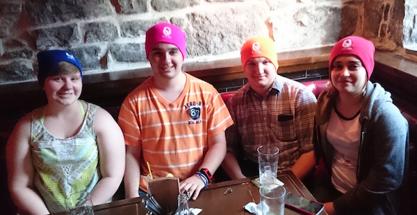 A few of PebbleOTT's April Meetup attendees sporting Music Boss beanies.