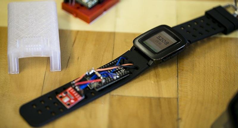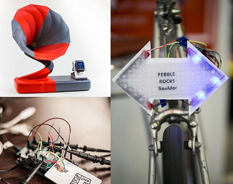 A team from Fitpay brought their expertise in the world of secure, contactless payments. Over the course of the weekend, they integrated their APIs with Pebble, creating the first contactless payment system on Pebble! Another team of students and graduates from the Turing School brought the biking culture of Boulder to play by developing a dock for the Pebble. This dock provided turn-by-turn navigation and automatic turn signals to keep bikers safer. A team of survivalists created a SurvivalStrap, with an integrated UHF transmitter for the stranded hiker. Two developers who had little hardware experience prior were able to integrate a GPS module and SD storage to create a untethered solution for a fitness/run tracker, complete with music playback. Tackmobile paired the Pebble platform with littleBits to create a convenient way to prototype smartstrap ideas.