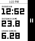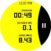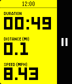 Sports アプリは、サイクリングやランニングなど、幅広いスポーツに適用できるアクティビティの継続時間と距離を表示します。アプリの設定に応じてペースまたは速度を表示する、設定可能な 3 番目のフィールドも使用できます。Sports API では、各フィールドのラベルをメートル法(デフォルト)またはヤードポンド法単位で表示するようにアプリを設定することもできます。