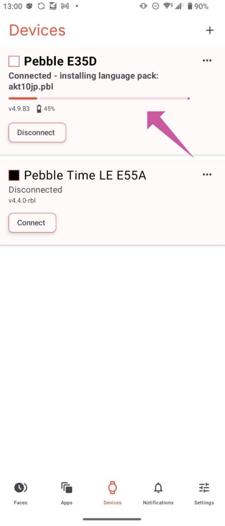 通常通り、スマホアプリとPebbleをペアリングします。通知などが来ている、カレンダーの予定が表示されている状態であれば大丈夫です。 なお、複数のPebbleを接続する場合、日本語化したいものに接続するようにしてください。(念のため、日本語化したいものだけ接続する方が安全だと思います。)2. 日本語化ファイル(*.pblファイル)をスマホでダウンロード