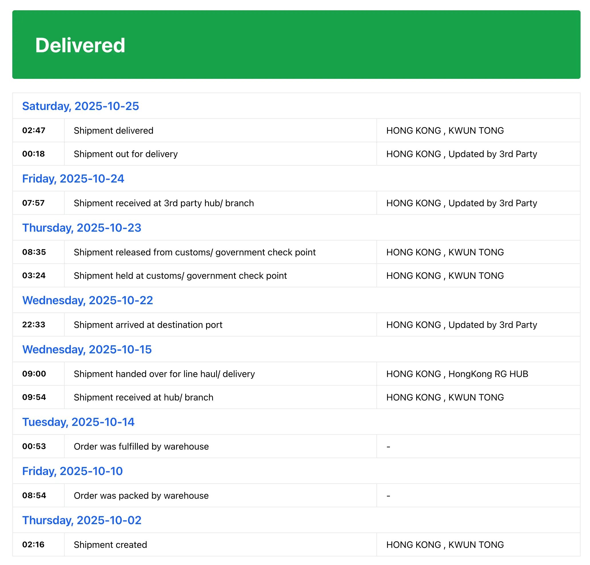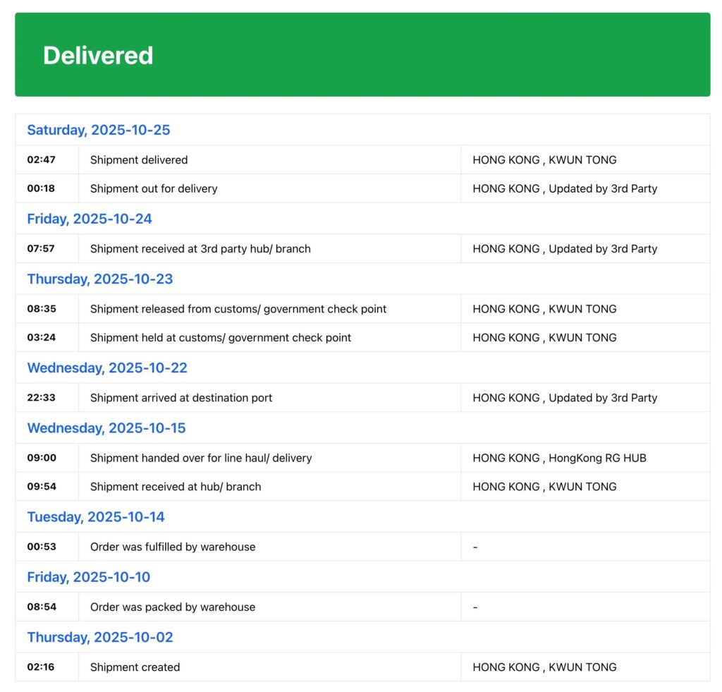 10/25に到着しました。到着した後で、「もうすぐ届くよ」メールが届いたりしましたが、無事届いて安心しました。商品が倉庫に入り、発送、到着までの感じは、トラッキングURLページに記載されていて、下記のような感じでした。(時刻は到着時刻から考えて、おそらくUTCで記載されているので、日本標準時に直すには、+8時間してください)